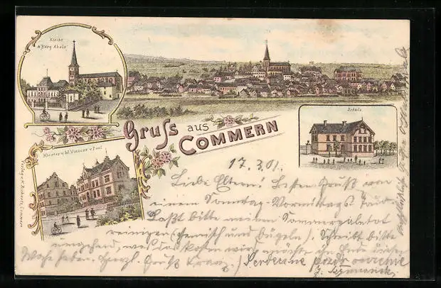 Lithographie Commern, Totalansicht mit Kirche und Schule