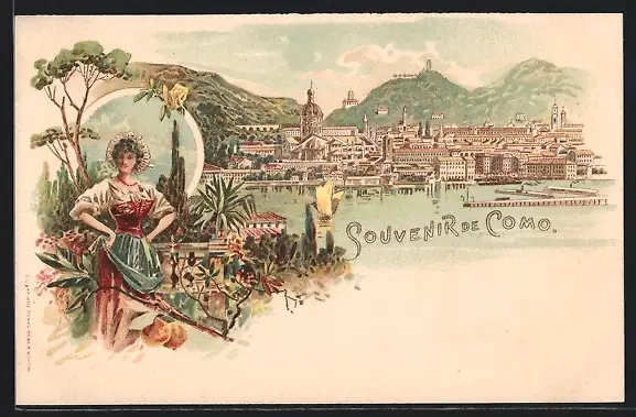 Lithographie Como, Ortsansicht mit Hafenpartie
