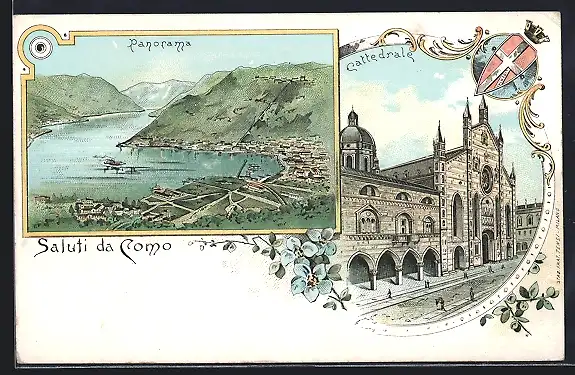 Lithographie Como, Panorama, Cattedrale, Wappen