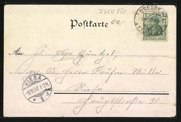 gelaufen 1907, Einriss links mittig, guter Zustand