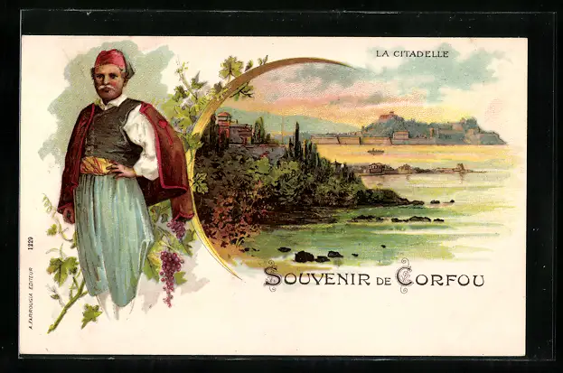 Lithographie Corfou, La Citadelle, Zitadelle im Abendlicht, Grieche in Tracht