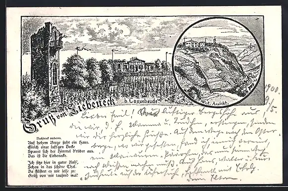 Lithographie Cossebaude, Gasthaus Liebeneck mit Turmruine