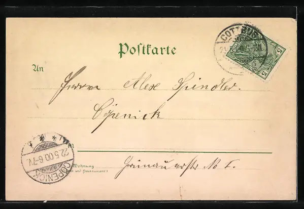 Personenbezogene Daten auf der Rückseite der Karte wurden durch blauen Textmarker unkenntlich gemacht. Die blauen Stellen sind auf die Vorderseite durchgeweicht und wirken sich negativ auf das Postkartenfoto aus