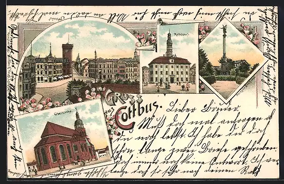 Lithographie Cottbus, Ortspartie, Kriegerdenkmal, Oberkirche