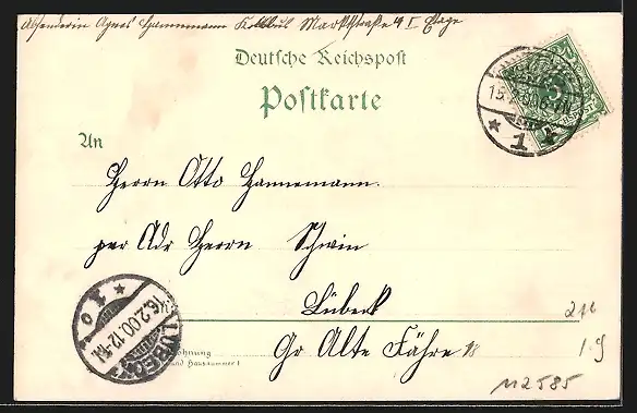Personenbezogene Daten auf der Rückseite der Karte wurden durch blauen Textmarker unkenntlich gemacht. Die blauen Stellen sind auf die Vorderseite durchgeweicht und wirken sich negativ auf das Postkartenfoto aus
