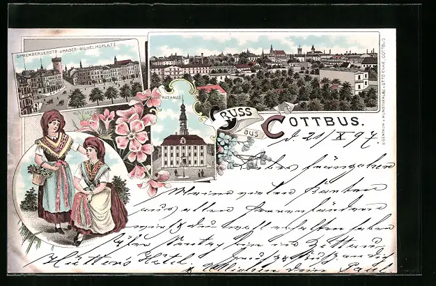 Lithographie Cottbus, Sprembergerstrasse und Kaiser Wilhelmsplatz, Rathaus, Panorama