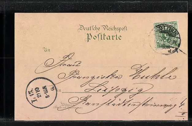 Personenbezogene Daten auf der Rückseite der Karte wurden durch blauen Textmarker unkenntlich gemacht. Die blauen Stellen sind auf die Vorderseite durchgeweicht und wirken sich negativ auf das Postkartenfoto aus