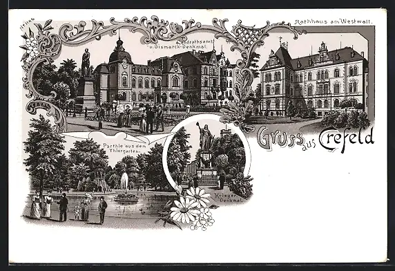 Lithographie Crefeld, Rathaus am Westwall, Landrathsamt und Bismarck-Denkmal
