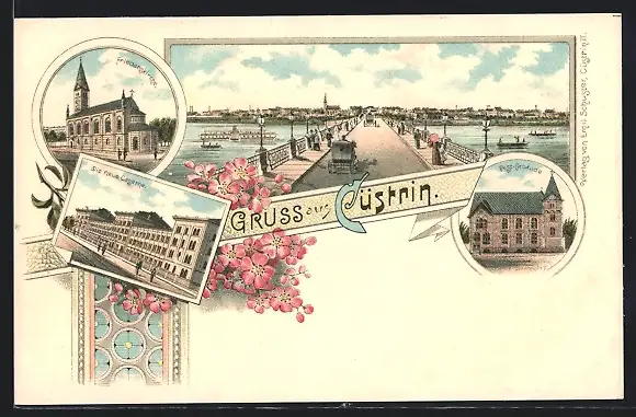 Lithographie Cüstrin, Post, neue Caserne, Friedenskirche