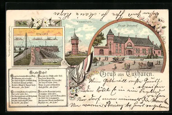 Lithographie Cuxhaven, Alte Liebe, Wasserturm, Stadt-Bahnhof