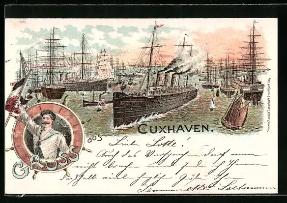 Lithographie Cuxhaven, Dampfer und Segelschiffe im Hafen