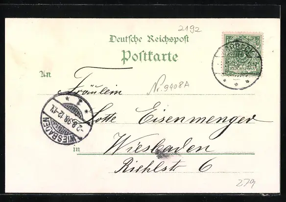 Personenbezogene Daten auf der Rückseite der Karte wurden durch blauen Textmarker unkenntlich gemacht. Die blauen Stellen sind auf die Vorderseite durchgeweicht und wirken sich negativ auf das Postkartenfoto aus