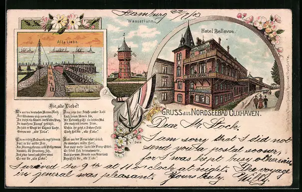 Lithographie Cuxhaven, Hotel Bellevue, Wasserturm, Alte Liebe