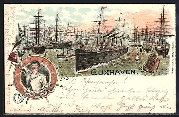 Lithographie Cuxhaven, Passagierdampfer und Segelschiffe, Matrose mit Reichsflagge