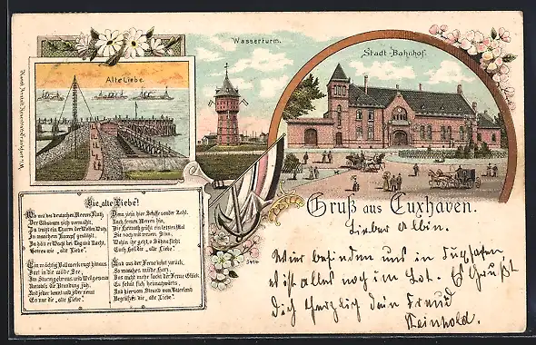 Lithographie Cuxhaven, Wasserturm, Stadt-Bahnhof, Gedicht Alte Liebe!
