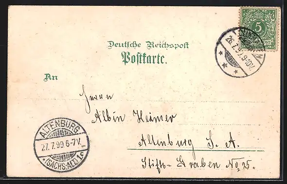 Personenbezogene Daten auf der Rückseite der Karte wurden durch blauen Textmarker unkenntlich gemacht. Die blauen Stellen sind auf die Vorderseite durchgeweicht und wirken sich negativ auf das Postkartenfoto aus