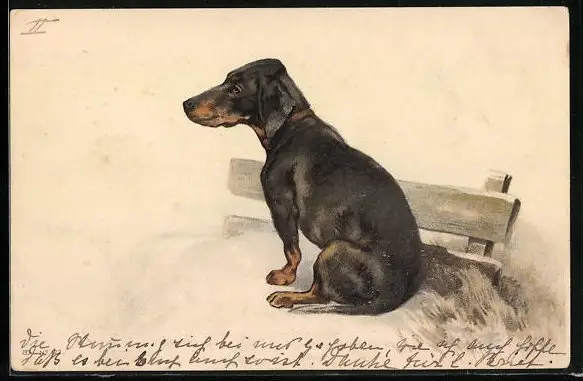 Lithographie Dackel sitzt auf einer verschneiten Bank