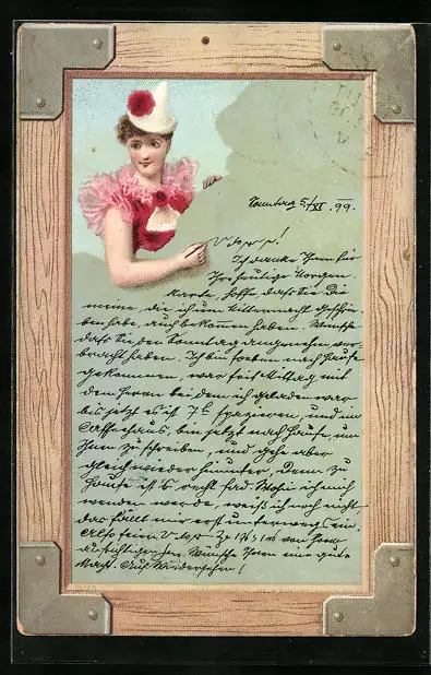 Lithographie Dame als Harlekin schreibt auf die Karte