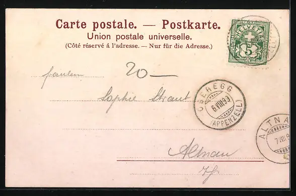 Personenbezogene Daten auf der Rückseite der Karte wurden durch blauen Textmarker unkenntlich gemacht. Die blauen Stellen sind auf die Vorderseite durchgeweicht und wirken sich negativ auf das Postkartenfoto aus