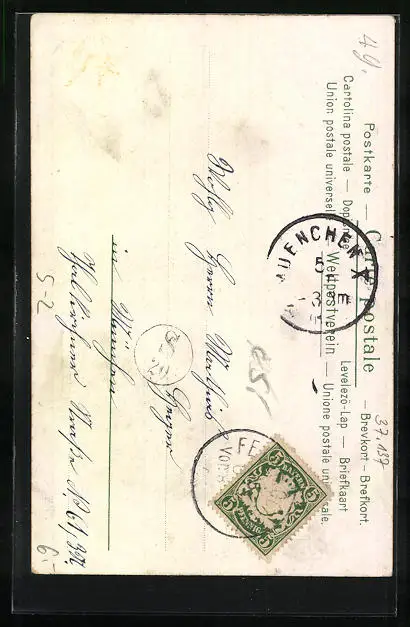 Personenbezogene Daten auf der Rückseite der Karte wurden durch blauen Textmarker unkenntlich gemacht. Die blauen Stellen sind auf die Vorderseite durchgeweicht und wirken sich negativ auf das Postkartenfoto aus
