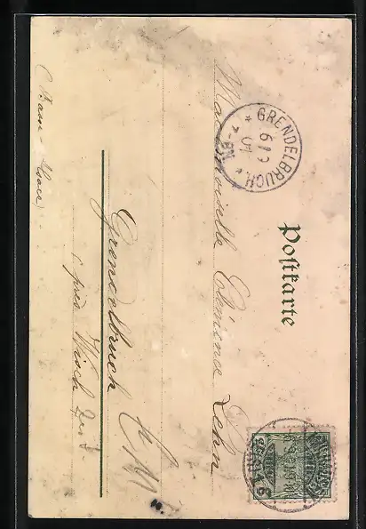 Personenbezogene Daten auf der Rückseite der Karte wurden durch blauen Textmarker unkenntlich gemacht. Die blauen Stellen sind auf die Vorderseite durchgeweicht und wirken sich negativ auf das Postkartenfoto aus