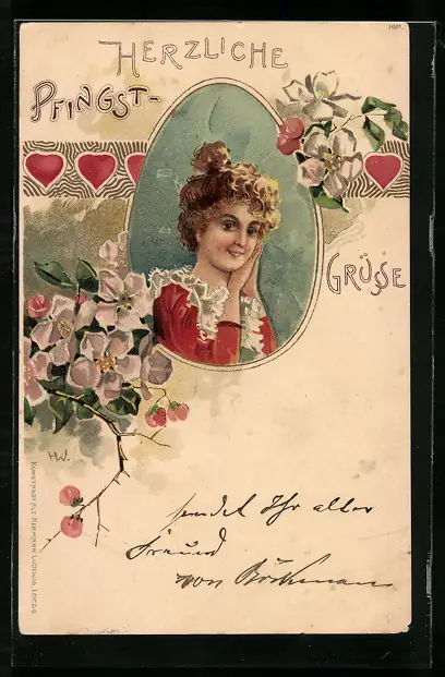 Lithographie Dame in rotem Kleid mit Blütenzweigen, Jugendstil