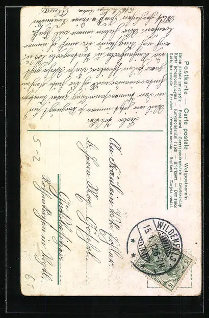 Personenbezogene Daten auf der Rückseite der Karte wurden durch blauen Textmarker unkenntlich gemacht. Die blauen Stellen sind auf die Vorderseite durchgeweicht und wirken sich negativ auf das Postkartenfoto aus