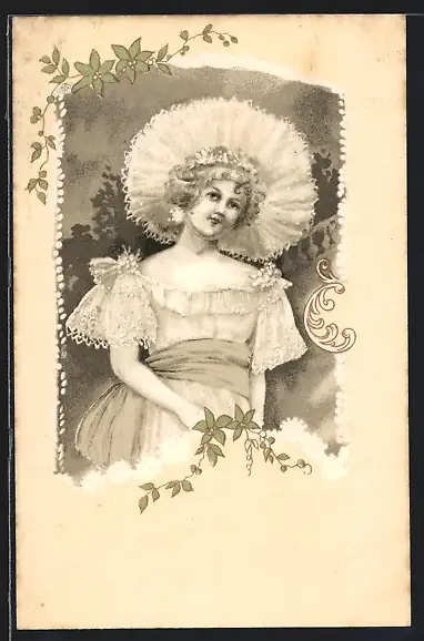 Lithographie Dame mit breitkrempigem Hut, Jugendstil