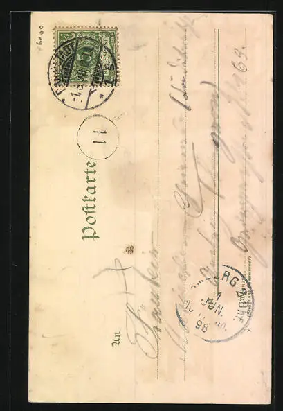 Personenbezogene Daten auf der Rückseite der Karte wurden durch blauen Textmarker unkenntlich gemacht. Die blauen Stellen sind auf die Vorderseite durchgeweicht und wirken sich negativ auf das Postkartenfoto aus