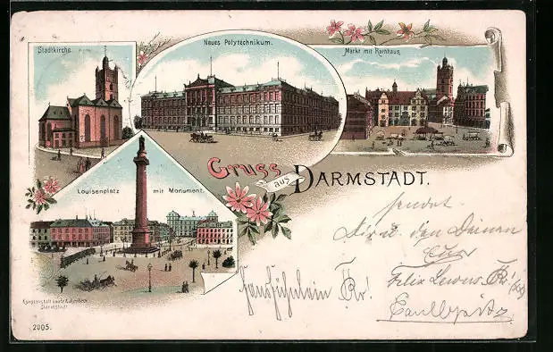 Lithographie Darmstadt, Neues Polytechnikum, Markt mit Rathaus, Stadtkirche