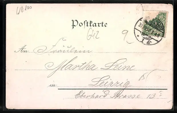 Personenbezogene Daten auf der Rückseite der Karte wurden durch blauen Textmarker unkenntlich gemacht. Die blauen Stellen sind auf die Vorderseite durchgeweicht und wirken sich negativ auf das Postkartenfoto aus