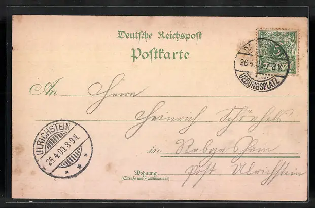 Personenbezogene Daten auf der Rückseite der Karte wurden durch blauen Textmarker unkenntlich gemacht. Die blauen Stellen sind auf die Vorderseite durchgeweicht und wirken sich negativ auf das Postkartenfoto aus