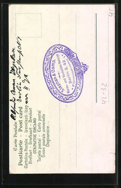 Personenbezogene Daten auf der Rückseite der Karte wurden durch blauen Textmarker unkenntlich gemacht. Die blauen Stellen sind auf die Vorderseite durchgeweicht und wirken sich negativ auf das Postkartenfoto aus