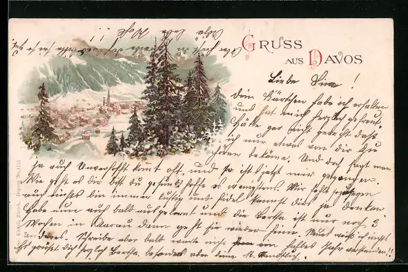 Lithographie Davos, Ortsansicht aus der Vogelschau
