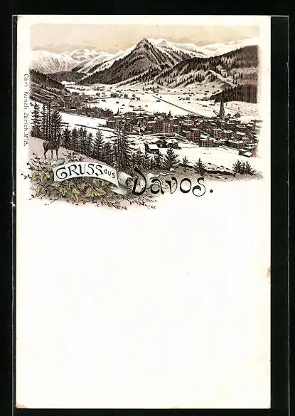 Lithographie Davos, Ortsansicht im Winter