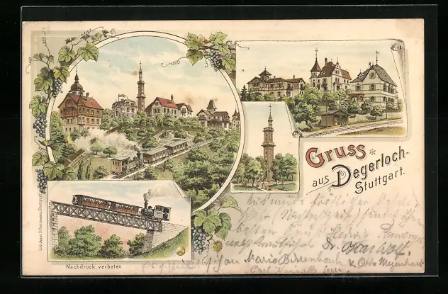 Lithographie Degerloch-Stuttgart, Bergbahn, Teilansicht mit Bergbahn, Turm