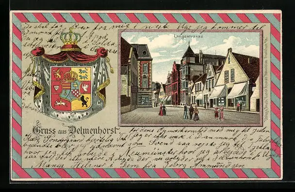 Lithographie Delmenhorst, Flaneure auf der Langestrasse, Wappen