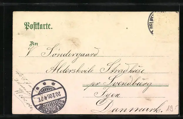 Personenbezogene Daten auf der Rückseite der Karte wurden durch blauen Textmarker unkenntlich gemacht. Die blauen Stellen sind auf die Vorderseite durchgeweicht und wirken sich negativ auf das Postkartenfoto aus