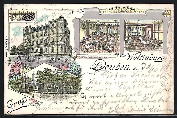 Lithographie Deuben, Restaurant zur Wettinburg v. Richard Pinkerr, Garten