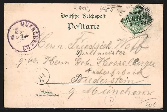 Personenbezogene Daten auf der Rückseite der Karte wurden durch blauen Textmarker unkenntlich gemacht. Die blauen Stellen sind auf die Vorderseite durchgeweicht und wirken sich negativ auf das Postkartenfoto aus