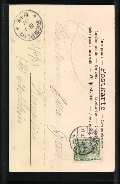 Personenbezogene Daten auf der Rückseite der Karte wurden durch blauen Textmarker unkenntlich gemacht. Die blauen Stellen sind auf die Vorderseite durchgeweicht und wirken sich negativ auf das Postkartenfoto aus