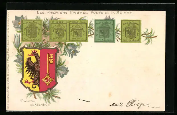 Lithographie Die ersten Briefmarken der Schweiz, Kanton Genf, Wappen
