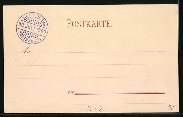Personenbezogene Daten auf der Rückseite der Karte wurden durch blauen Textmarker unkenntlich gemacht. Die blauen Stellen sind auf die Vorderseite durchgeweicht und wirken sich negativ auf das Postkartenfoto aus