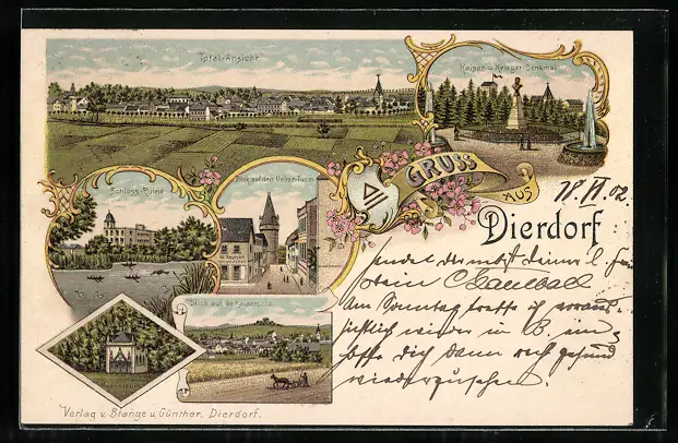 Lithographie Dierdorf, Totalansicht, Schloss-Ruine, Mausoleum