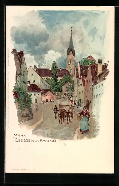 Lithographie Diessen a. Ammersee, Strassenpartie am Markt