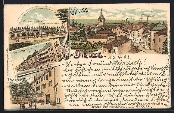 Lithographie Dieuze, Infanterie-Kaserne, Gasthof Klosterhof, Teilansicht