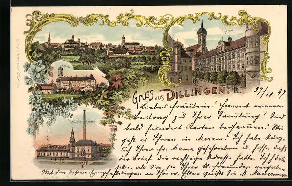 Lithographie Dillingen, Lyceum, Electrische Centrale, Ortsansicht