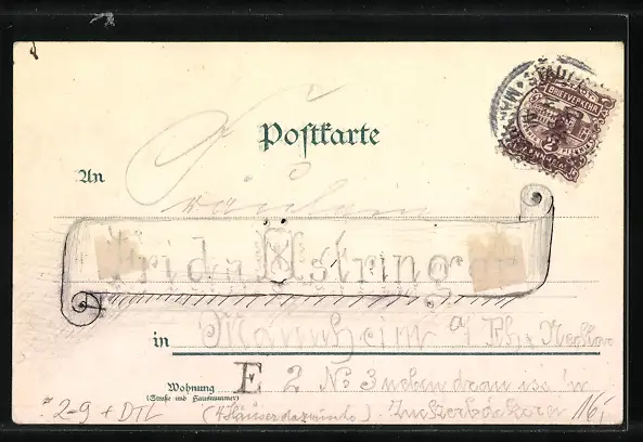 Personenbezogene Daten auf der Rückseite der Karte wurden durch blauen Textmarker unkenntlich gemacht. Die blauen Stellen sind auf die Vorderseite durchgeweicht und wirken sich negativ auf das Postkartenfoto aus