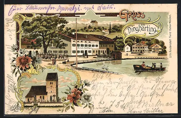 Lithographie Dingharting, Killers Gasthaus, Kirche