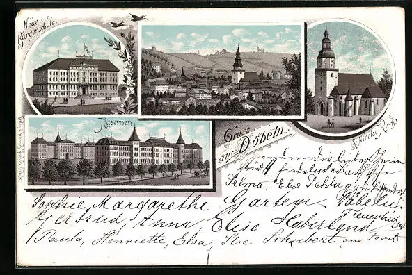 Lithographie Döbeln, Kasernen, St. Nicolai-Kirche
